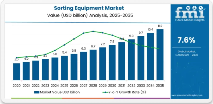 選別装置業界は、自動化された品質管理技術、材料回収ソリューション、高度な検査用途を再構築する10年にわたる拡大軌道への入り口に立っている。2025年の54億米ドルから2035年までに112億米ドルへ成長する市場の軌跡は、食品加工、リサイクル、鉱業、製造セクター全体で高度な光学選別構成とAI駆動型検査技術の採用が加速していることを示す大幅な成長過程を表している。