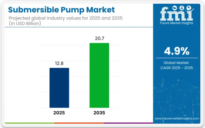 世界の水中ポンプ市場は、2025年に128億米ドルの売上高を生み出すと推定され、2035年までに207億米ドルに達すると予測されており、予測期間中の4.9%のCAGR(年平均成長率)を反映しています。市場拡大は、廃水インフラの継続的な更新とポンプ製造企業間の統合増加によって支えられている。