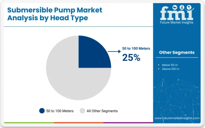 揚程50~100メートルの中水ポンプは、2025年に世界市場シェアの25%を占め、2035年まで年平均成長率(CAGR)5.1%で成長すると予測されている。この揚程範囲は、ボーリング井戸からの取水、農村給水計画、小規模灌漑システムなど幅広い用途に対応した。