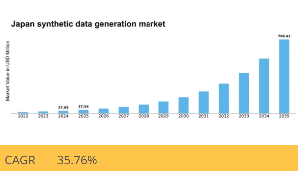 日本の合成データ生成市場は、AI技術の進歩、データプライバシー規制、多様なデータセットへの需要に牽引され、2025年から2035年にかけて35.76%のCAGRで成長が見込まれる。