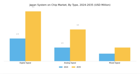 日本のシステムオンチップ市場は顕著な成長軌道を辿っており、主にタイプ別に形成された様々なセグメントに焦点を当てています。この枠組みにおいて、デジタル信号、アナログ信号、および混合信号は業界全体の景観において重要な位置を占めています。デジタル信号セグメントは、特に通信機器や民生用電子機器において様々な電子機器を可能にする重要な役割を担っているため、際立っています。高速データ処理と効果的な通信システムへの需要が高まる中、デジタル信号技術は現代市場が求める信頼性と効率性を提供します。