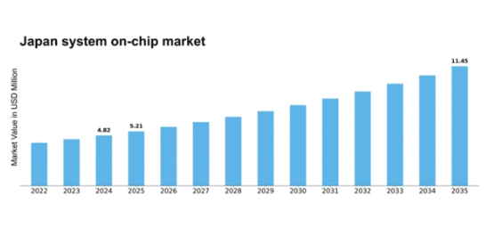 MRFRの分析によると、2024年の日本のシステムオンチップ市場規模は482万米ドルと推定された。日本のシステムオンチップ市場は、2025年の521万米ドルから2035年までに1,145万米ドルへ成長し、2025年から2035年の予測期間において年平均成長率(CAGR)8.19%を示すと予測されている。
