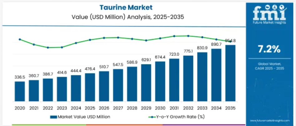 世界のタウリン市場は、2025年の4億7,640万米ドルから2035年には9億5,480万米ドルへと成長し、7.2%のCAGR(年平均成長率)を記録すると予測されています。市場拡大の要因としては、健康意識の高まり、栄養補助食品の普及、乳児用栄養食品やペットフードへのタウリンの使用拡大などが挙げられます。