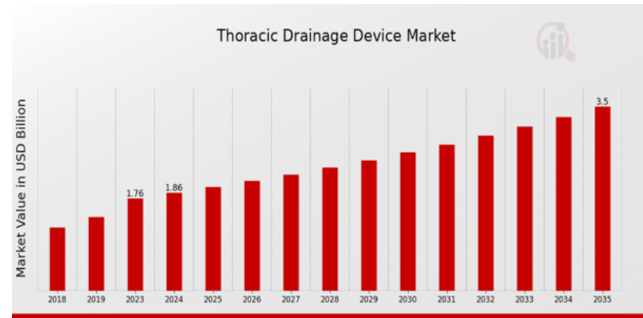 MRFRの分析によると、胸腔ドレナージ装置市場規模は2023年に17億6,000万ドル(USD Billion)と推定されました。胸腔ドレナージ装置市場産業は、2024年の18億6,000万ドル(USD Billion)から2035年には35億ドル(USD Billion)に成長する見込みです。胸腔ドレナージ装置市場のCAGR(成長率)は、予測期間中(2025年〜2035年)に約5.89%になると予測されます。