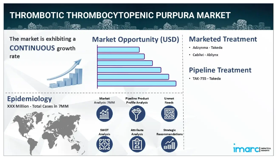 血栓性血小板減少性紫斑病(TTP)市場は、IMARC社の新報告書「血栓性血小板減少性紫斑病(TTP)市場規模、疫学、市場内医薬品売上高、開発中の治療法、および地域別展望 2025-2035年」において包括的に分析されております。血栓性血小板減少性紫斑病(TTP)とは、血小板の塊が細小血管内に蓄積する疾患です。この疾患には、免疫介在性TTP(後天性)と先天性TTP(遺伝性)の2種類があります。主な症状には、血小板数の著しい減少(血小板減少症)、赤血球の不適切な破壊(溶血性貧血)、そして最も細い動脈に形成される微小血栓によって引き起こされる神経系、心臓、その他の臓器における異常が含まれます。