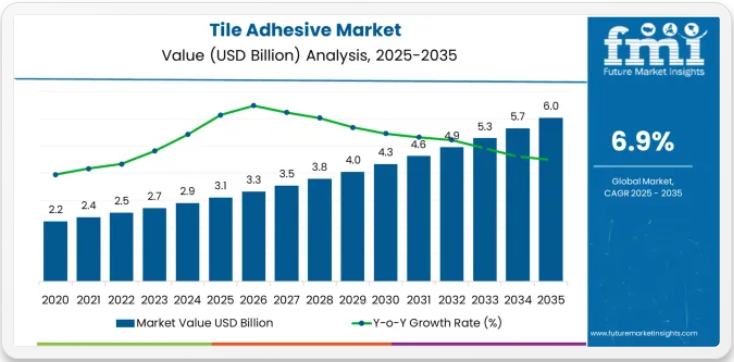タイル接着剤業界は、床施工技術、防水建築用途、ポリマー改質接着ソリューションを再構築する10年にわたる拡大軌道への入り口に立っている。2025年の31億米ドルから2035年までに60億米ドルへ拡大する市場の軌跡は、住宅建設、商業改修、産業用床材分野におけるポリマー改質セメント系配合剤と低VOC接着剤技術の採用加速を示す大幅な成長過程を体現している。