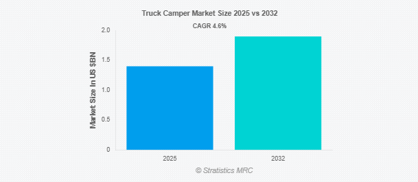 Stratistics MRCによると、トラックキャンパーの世界市場は2025年に14億ドルを占め、予測期間中の年平均成長率は4.6%で、2032年には19億ドルに達する見込みです。トラックキャンパーは、ピックアップトラックの荷台に搭載されるコンパクトで取り外し可能な娯楽用車両で、専用の牽引ユニットを必要とせずに移動可能な居住空間を提供します。多用途に使用できるよう設計されており、寝室、キッチン設備、収納を備えているため、オフロード旅行や遠隔地でのキャンプに最適です。軽量な構造で操縦性が高く、車の効率を維持しながら険しい地形を探検することができます。トラックキャンパーは、従来のRV車に代わる柔軟で費用対効果の高い冒険旅行を求めるアウトドア愛好家の間で人気があります。