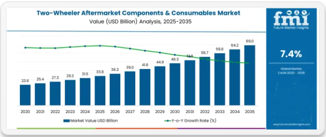 二輪車アフターマーケット部品・消耗品市場は、2025年の337億8,000万米ドルから2035年までに690億米ドルへ、年平均成長率(CAGR)7.4%で拡大する大幅な成長過程を提示している。二輪車所有者が車両メンテナンス、性能最適化、費用対効果の高い修理を優先する中、アフターマーケット部品は基本的な交換部品から、標準的なオートバイ、スクーター、プレミアムオートバイセグメント全体で車両の長寿命化、カスタマイズ、性能向上を可能にする包括的なソリューションへと進化している。