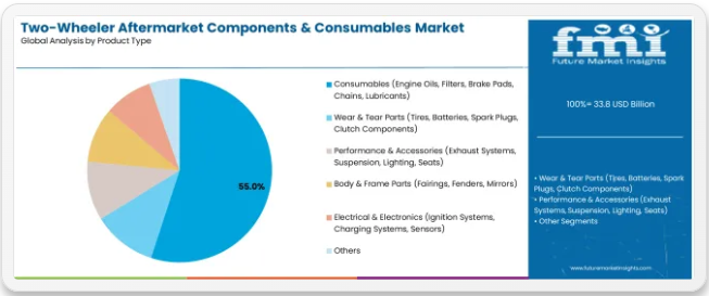 市場は車両性能と耐久性を向上させる先進的・高耐久・軽量部品へと進化中。消費者のカスタマイズ需要増加を受け、メーカーは専用キット・高性能部品・外観アップグレード部品を導入している。センサーやリアルタイム監視システムなどのスマート技術が部品に統合され、メンテナンス効率が向上している。設置や保管の容易さを考慮したコンパクト設計への注目も高まっている。品質と信頼性に対する意識の高まりが消費者の嗜好を形作り続け、二輪車アフターマーケットにおける部品・消耗品市場が成長している。