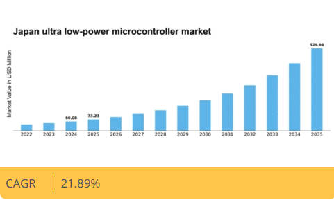 日本の超低消費電力マイクロコントローラ市場は、IoTの拡大、エネルギー効率化の需要、自動化のトレンドに牽引され、2024年から2035年にかけて年平均成長率(CAGR)21.89%で成長が見込まれる。