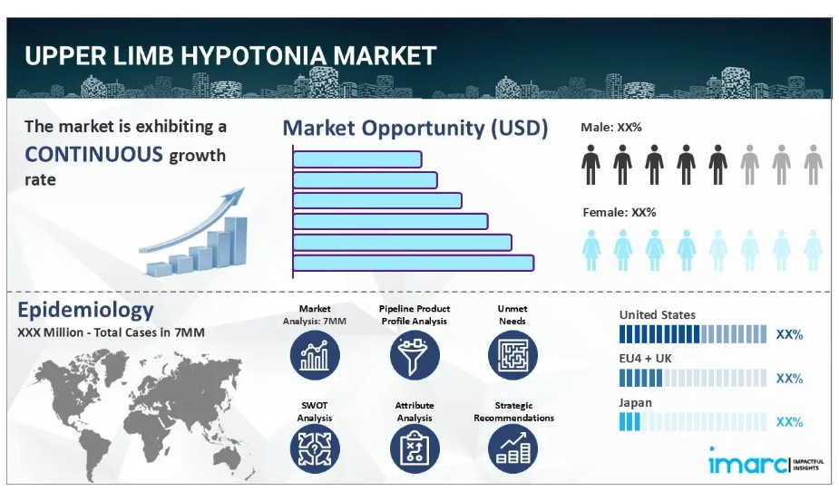 IMARC社の新報告書「上肢筋緊張低下症市場規模、疫学、市場内医薬品売上高、開発中の治療法、および地域別展望 2025-2035年」において、上肢筋緊張低下症市場が包括的に分析されました。上肢低緊張症とは、上腕、前腕、手を含む上肢の筋肉において筋緊張が低下する状態を指します。これにより上肢の筋力や協調性が低下し、筆記などの細かい運動技能を要する動作が困難となる場合があります。本疾患に関連する最も一般的な症状には、筋緊張・筋力の低下、反射の鈍化、過度の柔軟性、言語障害、活動持続時間の減少、姿勢障害などが挙げられます。乳児期においては、頭部の支えが弱い、あるいは全く支えられない状態、ハイハイなどの運動能力発達の遅れ、物を握る動作を含む微細運動能力の発達遅延として現れます。上肢筋緊張低下症の診断には、通常、患者の症状、病歴の確認、および身体検査が必要です。医療従事者は、神経や筋肉の機能を測定するため、筋電図検査、MRI、CTスキャンなどの画像検査を追加で実施する場合があります。