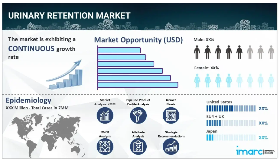 IMARC Groupの新報告書は、米国、EU4(ドイツ、スペイン、イタリア、フランス)、英国、日本における尿閉滞留市場の包括的な分析を提供します。これには、治療実践、市場流通中および開発中の薬剤、個別療法のシェア、主要7市場における市場動向、主要企業とその薬剤の市場実績などが含まれます。本報告書はまた、主要7市場における現在および将来の患者層についても提示しています。本報告書によれば、米国は尿閉症患者数が最も多く、その治療市場も最大規模を占めています。さらに、現在の治療実践/アルゴリズム、市場推進要因、課題、機会、償還シナリオ、未充足医療ニーズなども本報告書に記載されております。本報告書は、製造業者、投資家、ビジネス戦略家、研究者、コンサルタント、および何らかの形で尿閉市場に関与している、あるいは参入を計画している全ての方にとって必読の資料です。