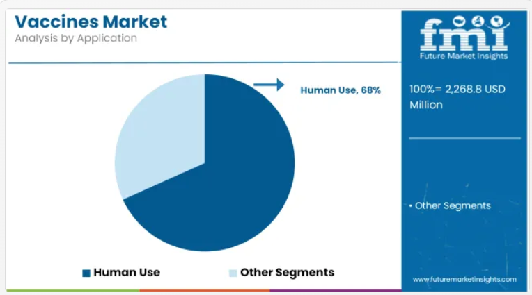 人間の使用用途は、2025年にワクチン市場シェアの68.2%を占めると予測されています。このセグメントは、全年齢層における感染症による罹患率・死亡率低減を目的とした予防接種プログラムの優先的実施により強化されてきました。公衆衛生施策と資金投入は、小児・青年・成人層における高い接種率達成に向けられています。