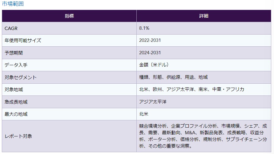 | この文章は、特定の市場に関する詳細な調査レポートの概要を示しています。調査の方法や範囲、目的について説明し、次に市場の定義と概要が述べられています。レポートは、さまざまなスニペットのタイプ(タイプ別、形態別、ソース別、用途別、地域別)に分かれた情報を提供しています。 ダイナミクスに関しては、影響を与える要因として、ビーガン人口の増加やビーガン食に対する意識の高まりが挙げられています。一方で、厳しい規制が阻害要因となっていることが指摘されています。また、ビジネスチャンスや影響分析についても言及されています。 業界分析では、ポーターのファイブフォース分析やサプライチェーン分析、価格分析、規制分析、ロシア・ウクライナ戦争の影響分析、さらにDMIの意見がまとめられています。また、COVID-19の影響についても詳細な分析が行われており、パンデミック前、中、後のシナリオが考察されています。 市場のタイプ別、フォーム別、ソース別、用途別、地域別に細かい分析が行われており、各カテゴリーの市場規模や成長率、魅力度指数が示されています。地域ごとの市場紹介や主要ダイナミクスも詳述され、北米、ヨーロッパ、南米、アジア太平洋、中東およびアフリカの各地域についての情報が網羅されています。 競争環境に関しては、競争シナリオ、市場ポジショニング/シェア分析、M&A分析が行われ、主要企業(DSM、カーギル社、BASF SEなど)の概要が紹介されています。最後に付録として、会社のサービスや問い合わせ情報が記載されています。 この調査は、企業が市場の動向を把握し、戦略を立てるために重要な情報を提供しており、全体として市場の包括的な理解を促進する内容となっています。 |