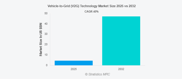 Stratistics MRCによると、世界のVehicle-to-Grid(V2G)技術市場は2025年に44億8000万ドルを占め、予測期間中の年平均成長率は40%で、2032年には472億2000万ドルに達する見込みです。電気自動車(EV)と送電網は、ビークル・ツー・グリッド(V2G)として知られる技術により、双方向でエネルギーを交換することができます。V2Gは、EVに余分な電力を蓄えさせ、需要の多い時間帯に系統に供給することで、系統の安定性とエネルギー効率を向上させます。V2Gは再生可能エネルギー源の統合を促進し、電力コストを下げ、負荷のバランスを取ります。V2Gを搭載したEVは、移動可能なエネルギー貯蔵デバイスとして機能し、エネルギー・エコシステムの回復力と持続可能性を高めるため、スマートグリッドとクリーンエネルギー・プロジェクトに不可欠な要素です。