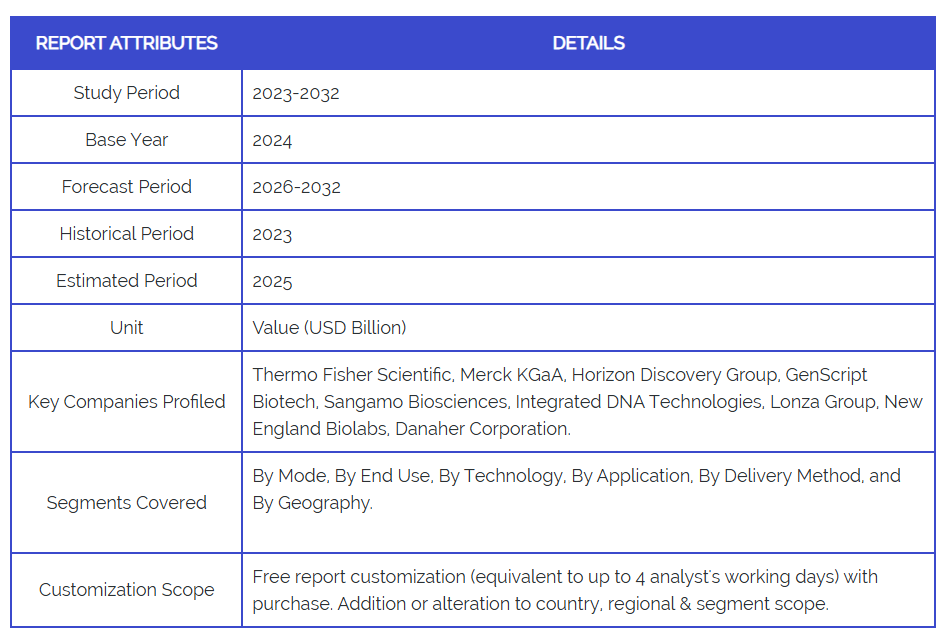 - 主要企業: Thermo Fisher Scientific, Merck KGaA, Horizon Discovery Group, GenScript Biotech, Sangamo Biosciences, Integrated DNA Technologies, Lonza Group, New England Biolabs, Danaher Corporation.