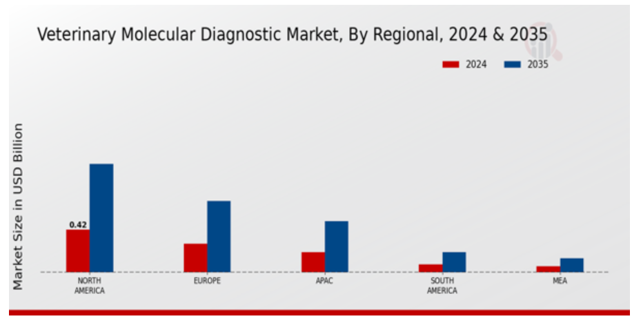 動物用分子診断市場の地域別セグメントでは、北米が大半のシェアを占めており、2024年の市場規模は4.2億ドル、2035年には10.6億ドルに成長すると予測され、この業界における大きな影響力を示しています。これに次ぐのがヨーロッパで、2024年の市場規模は2.8兆ドル、2035年には7兆ドルに達すると予測されており、主要市場として重要な役割を担っています。APAC地域の2024年の市場規模は0.2ビリオンですが、2035年には0.5ビリオンまで成長する見込みです。