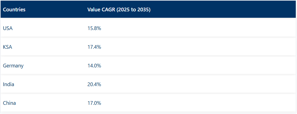 その後、2025年上半期から2035年下半期にかけては、CAGRが上半期で15.9%と大幅に増加し、下半期では16.8%と比較的緩やかな伸びを維持すると予測される。上半期では市場が30ベーシスポイント(BPS)の減少を示した一方、下半期では20ベーシスポイント(BPS)の増加が確認された。