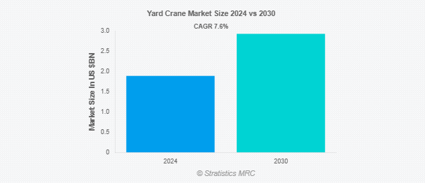 Stratistics MRCによると、ヤードクレーンの世界市場は2024年に18.9億ドルを占め、予測期間中の年平均成長率は7.6%で、2030年には29.3億ドルに達する見込みです。ヤードクレーンは、コンテナターミナル、船積みヤード、工業用倉庫などでコンテナや重量貨物のハンドリングや積み付けに使用される大型リフティングマシンです。これらのクレーンは、スペースの利用を最適化し、物流や輸送ハブの業務効率を向上させるように設計されています。コンテナの移動に柔軟性と精度を提供する一般的な種類は、レール搭載ガントリー(RMG)クレーンとゴムタイヤ式ガントリー(RTG)クレーンです。さらに、エネルギー効率の高いシステム、GPS追跡、高度な自動化を備えた最新のヤードクレーンは、運用経費と環境への悪影響を低減しながら生産量を増加させます。