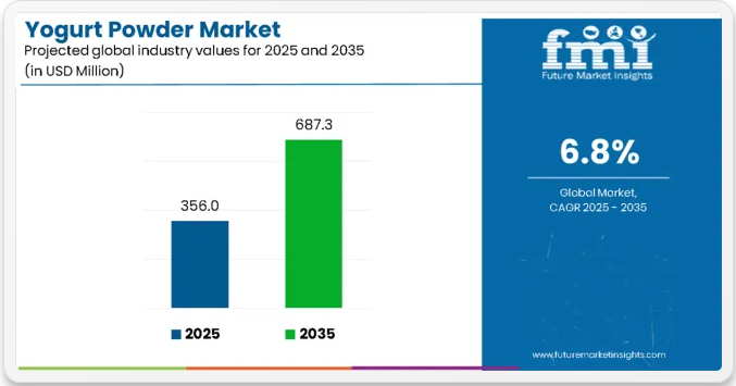 世界のヨーグルトパウダー市場は、2025年の3億5600万米ドルから2035年までに6億8730万米ドルへ成長し、3億3130万米ドルの絶対的増加と約6.8%のCAGR(年平均成長率)を記録すると予測されています。これは総成長過程93.1%に相当し、2025年から2035年にかけて市場は年平均成長率(CAGR)6.8%で拡大すると予測される。同期間中に市場規模は約1.93倍に成長すると見込まれており、これは便利な乳製品への需要増加と多様な食品加工業界における用途拡大に支えられている。