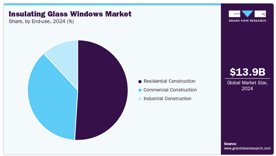 家庭用建設セグメントは断熱ガラス窓産業を牽引し、2024年には51.0%という最高の収益シェアを占めました。これは、住宅所有者が快適性の向上、電気代の削減、安定した室内温度の維持を目的に断熱窓を選択するケースが増加しているためです。特に老朽化した住宅ストックにおける改修活動の増加は、旧式の単板窓の広範な交換を支えています。現代の住宅設計では窓面積が大きくなる傾向があり、より高い断熱性能が求められます。騒音対策への意識の高まりも、特に人口密集都市部における家庭用採用を促進しています。手頃な価格と製品バリエーションにより、断熱窓は様々な所得層で利用可能となっています。これらの要因が、住宅建設分野における主導的セグメントとしての地位維持に寄与しています。