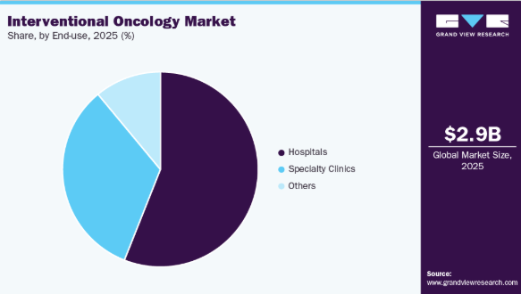 2025年には肝臓がんセグメントが27.8%と最大の収益シェアを占めました。肝癌セグメントは、いくつかの主要な要因に牽引され、インターベンショナル腫瘍学市場の中で最大の割合を占めています。肝癌、特に肝細胞癌(HCC)は、世界で最も一般的かつ致死性の高い癌の一つであり、米国癌協会(American Cancer Society)の推定によると、2023年には米国だけで約42,230件の新規症例と30,230件の死亡が発生するとされています。さらに、世界がん研究基金国際のデータによれば、2022年には約866,136人が肝臓がんと診断され、世界で6番目に多いがんとなっています。高い罹患率と死亡率により、先進的な治療法の必要性が高まっています。インターベンショナル・オンコロジー(介入腫瘍学)は、ラジオ波焼灼療法(RFA)、経動脈的化学塞栓療法(TACE)、マイクロ波焼灼療法などの低侵襲技術を提供しており、これらは肝腫瘍の治療に非常に効果的です。例えば、中間期肝細胞癌(HCC)患者において、TACEが生存率を大幅に改善できることが研究で示されている。さらに、これらの治療の精度と有効性を高める画像誘導下手技の採用増加が、市場の成長をさらに後押ししている。ボストン・サイエンティフィックやメドトロニックといった企業は、肝癌に特化した革新的なインターベンショナル・オンコロジー機器の開発に多額の投資を行っており、この分野の市場可能性を示している。