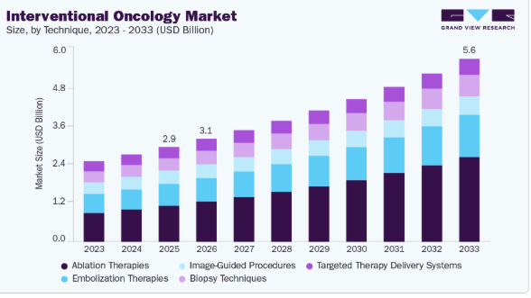 WHOによれば、世界的にがん症例数が大幅に増加しており、より良いがん治療を可能にする先進的ソリューションの必要性が高まっている。2022年には約2,000万件の新規がん症例と970万人の死亡が発生した。2050年までに症例数は3,500万件以上に増加し、世界のがん負担は77%増加すると予測されている。ラジオ波焼灼療法(RFA)、経動脈的化学塞栓療法(TACE)、凍結療法など、様々な低侵襲技術を有するインターベンショナル・オンコロジーは、回復期間の短縮や合併症発生率の低下など、従来の手術に比べて大きな利点を提供する。世界のがん負担が増加し続ける中、患者の治療成績と生活の質を改善する能力に後押しされ、これらの先進的インターベンショナル技術の導入が加速すると予想される。