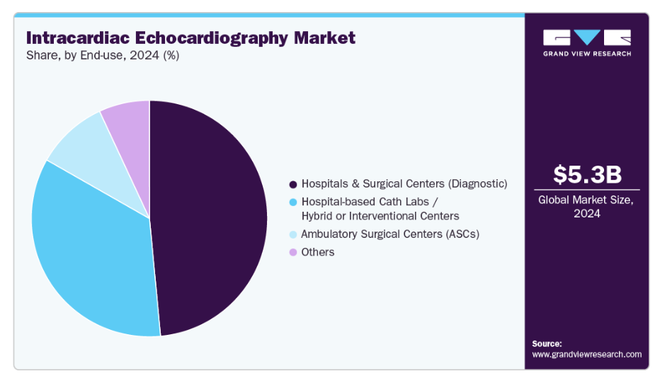 2024年、電気生理学(EP)処置セグメントが心内エコー市場を牽引し、40.50%という最大の収益シェアを占めました。このセグメントの成長は、増加する心血管疾患(CVD)症例とEP処置の増加に支えられています。EP処置は、心不整脈の診断と治療を目的とした低侵襲的介入です。ボストン・サイエンティフィック社の記事によれば、米国では2023年に約85万件のEPアブレーション処置が実施され、前年比で大幅な増加を示しています。これらの処置の多くは、特に心房細動や左心耳閉鎖といった複雑な症例において、心腔のリアルタイム可視化、カテーテル誘導、病変評価のためにICEに依存しています。したがって、EP処置件数の増加は、心腔内エコーシステムおよびカテーテルの採用拡大に直接寄与しており、これらは現代の電気生理学的ワークフローにおいて重要な構成要素となっております。