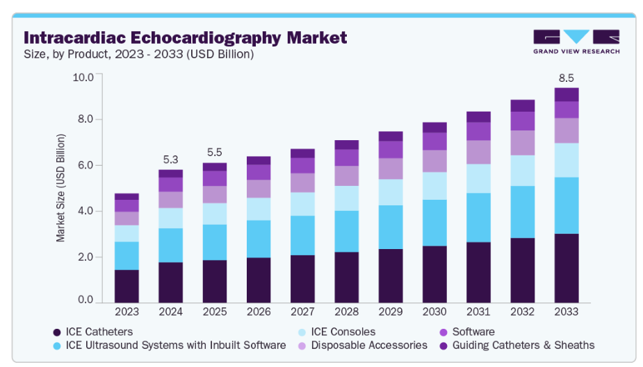 心臓内エコー検査(ICE)市場は、特に電気生理学および構造的心臓インターベンションにおいて、低侵襲心臓処置の需要が継続的に高まるにつれて成長しています。市場成長は、心臓解剖構造をリアルタイムかつ高解像度で可視化し、手技の安全性と効率性を向上させる先進的画像診断法への移行によって牽引されています。さらに、カテーテル設計の継続的進化、3D/4D画像機能の向上、デジタルマッピング・ナビゲーションシステムとの統合が進むことで、臨床成果が向上し、ワークフローが効率化され、臨床現場でのより広範な受容が促進されています。