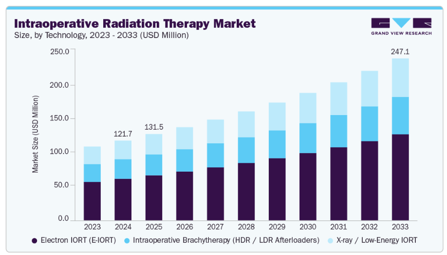 外部照射放射線治療(EBRT)および近接照射療法は、特に先進機器へのアクセスが限られる地域において、IORTの代替手段となります。EBRTは幅広い適用性を有しますが、複数回の治療セッションを必要とし、患者の利便性を低下させます。近接照射療法は限局性腫瘍の治療において競争力を維持していますが、術中精度に欠けます。IORTの独自の利点は、手術中に即時かつ高線量を照射できる点にあります。この臨床的差別化により、専門的腫瘍学領域での代替リスクは限定的です。