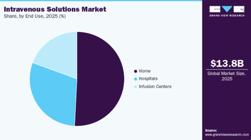 最終用途別では、2025年に在宅セグメントが最大の市場シェアを占め、予測期間中に最も高いCAGRで成長すると見込まれています。これは慢性疾患患者における在宅医療の選好度上昇が要因です。化学療法、感染症に対する抗生物質治療、嚥下障害などの状態に対する水分補給療法など、長期的な静脈内療法を必要とする多くの患者は、病院やクリニックではなく自宅で治療を受けることを好みます。この変化は主に、頻繁な通院回避、院内感染リスク低減、より高い生活の質維持への要望によって推進されている。