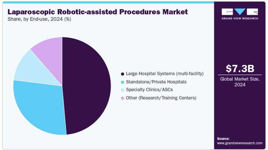 2024年時点で、大規模病院システム(複数施設)セグメントが48.60%の収益シェアを占め市場を牽引しました。このセグメントは、豊富な資本資源、手術症例の増加、そして手術成果向上のための先進技術導入への戦略的重点化によって支えられています。これらの医療機関は、腹腔鏡下ロボット手術の実施に必要なトレーニングやインフラ整備により多くの資源を割り当てています。例えば、ワールド・ラパロスコピー病院は、インドで初めて最先端のダ・ヴィンチ・ロボティック手術治療とトレーニングを導入した私立病院です。