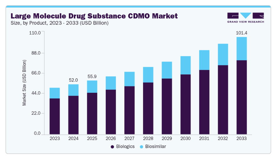 【英語タイトル】Large Molecule Drug Substance CDMO Market Size, Share & Trends Analysis Report By Product, By Service (Contract Manufacturing, Contract Development), By Source, By End-use, By Region, And Segment Forecasts, 2025 - 2033