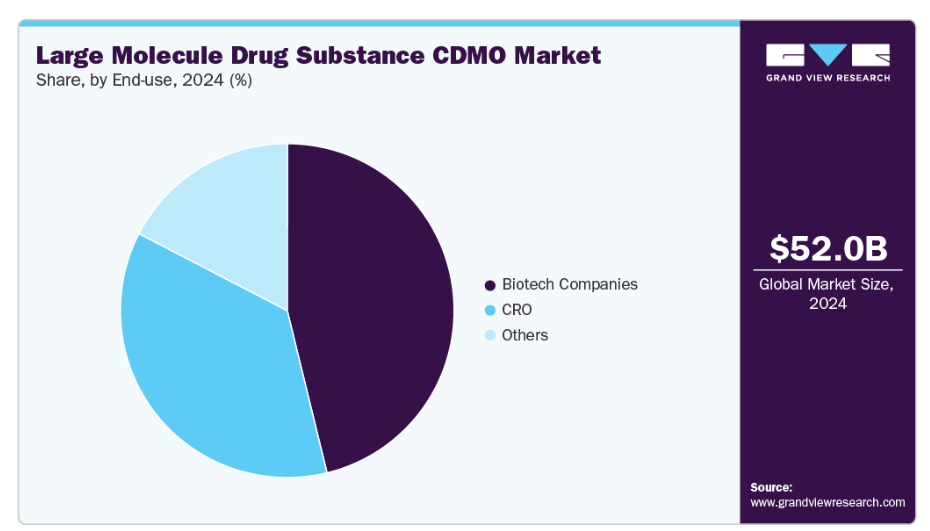さらに、製薬企業はCDMOに大型分子薬の開発・製造を委託することで、インフラ投資、運営リスク、規制対応負担を軽減できます。多くの新興バイオテック企業は、自社内で生物学的製剤開発能力を構築する時間、資金、経験が不足しています。研究開発や商業化にリソースを集中させるため、CDMOは医薬品開発の迅速化、経費削減、納期短縮を実現する継続的なサービスを提供します。柔軟性と市場投入スピードが不可欠な競争の激しい業界において、この費用対効果の高いソリューションは必須となっています。CDMOは、リスクを軽減し拡張性のあるソリューションを提供することで、バイオロジクスパイプラインを追求する大手製薬会社と小規模な革新企業の双方を支援する上で極めて重要です。