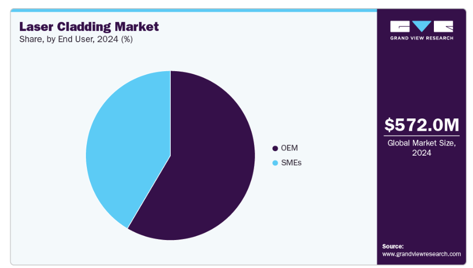 2024年時点ではOEMが市場を主導し、58.8%という最大の収益シェアを占めております。OEMメーカーは製品の性能、耐久性、寿命を向上させるため、レーザークラッディング技術の採用を拡大しています。レーザークラッディングは高出力レーザーを用いて基材上に薄層の材料を堆積させる技術であり、コーティング材を溶融させ母材に精密に融合させます。このプロセスにより強固な金属結合が形成され、優れた耐摩耗性、耐食性、耐熱性を備えたコーティングが実現します。