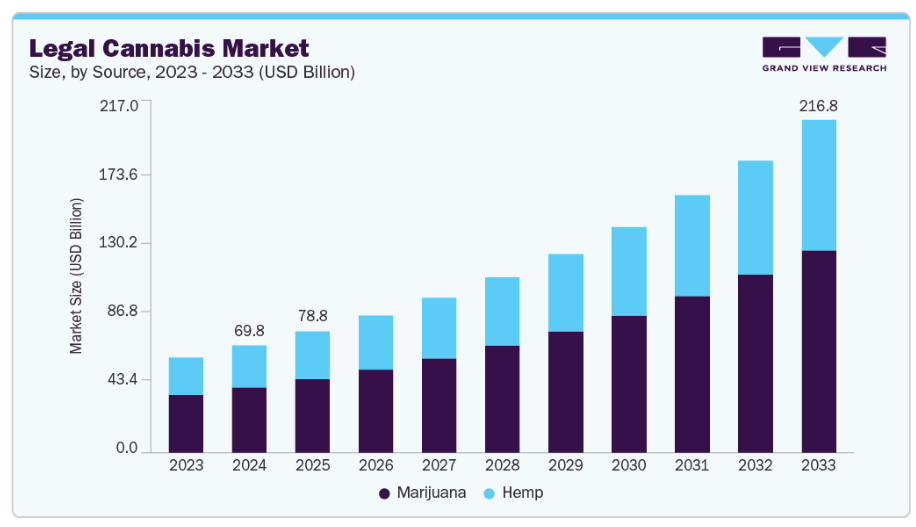 【英語タイトル】Legal Cannabis Market Size, Share & Trends Analysis Report By Source (Marijuana, Hemp), By Derivative (CBD, THC), By End Use (Medical Use, Recreational Use, Industrial Use), By Region, And Segment Forecasts, 2025 - 2033