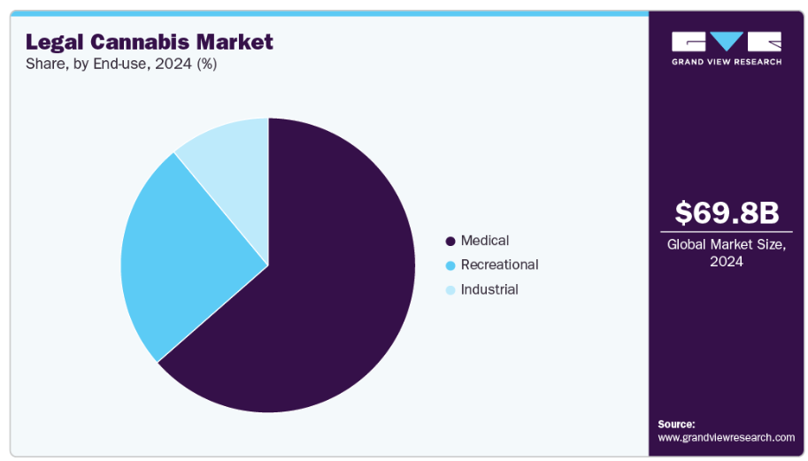 最終用途別では、2024年に医療用途セグメントが合法大麻市場を支配し、収益シェアは63.56%を占めました。糖尿病、癌、関節炎、うつ病、不安神経症、てんかんなど、さまざまな慢性疾患の治療に大麻が受け入れられるようになったことが、このセグメントの成長に貢献しています。さまざまな症状の治療に大麻薬が承認されたことが、成長を推進しています。例えば、Syndros と Marinol は、嘔吐や吐き気などの化学療法の副作用を治療するために FDA が承認した 2 つの特定の薬です。さらに、米国の各州で大麻の合法化が進んでいることも、このセグメントの成長を促進しています。