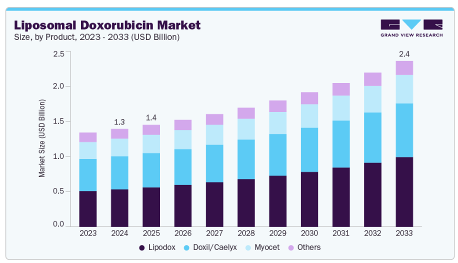 本レポートは、2021年から2033年までの各サブセグメントにおける最新の業界動向分析を提供するとともに、グローバル、地域、国レベルでの収益成長を予測します。本調査において、Grand View Researchはグローバルリポソームドキソルビシン市場レポートを製品、用途、流通チャネル、地域に基づいてセグメント化しました: