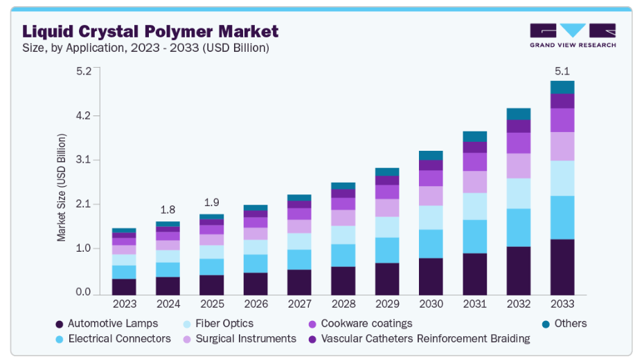 本レポートでは、2021年から2033年までの各サブセグメントにおける最新業界動向の分析に加え、グローバル・地域・国レベルでの収益成長予測を提供します。本調査では、Grand View Researchは液晶ポリマー市場レポートを、用途、最終用途、地域に基づいてセグメント化しております:
