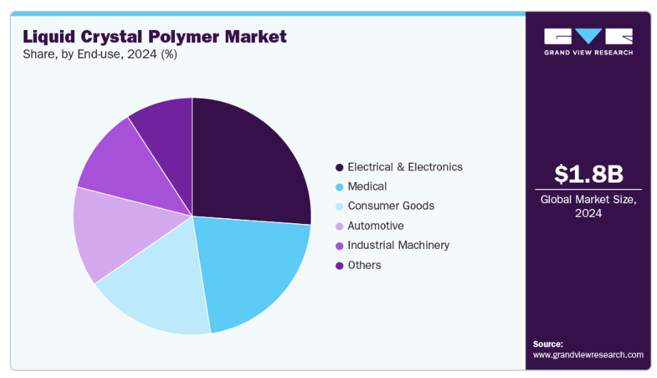 医療分野は予測期間中に13.2%という大幅なCAGRで拡大すると見込まれています。医療機器設計者は、小型化を実現し、繰り返しの滅菌サイクルに耐え、長期使用における厳格な生体適合性の要求を満たす材料をますます必要としています。医療用途向けに設計されたLCPグレードは、低吸湿性、耐薬品性、寸法安定性を備えており、小型・薄肉筐体、カテーテル編組、滅菌処理下での予測可能な挙動が不可欠な埋込型パッケージングを支えます。これらの特性は、金属部品の代替による軽量化と製造簡素化が進む診断機器、薬剤送達システム、特定の埋込型電子機器における機会を創出します。医療グレードLCPの検証と規制対応支援をエンジニアリングサービスと共に提供する企業は、機器OEMメーカーにおける採用加速に貢献できます。
