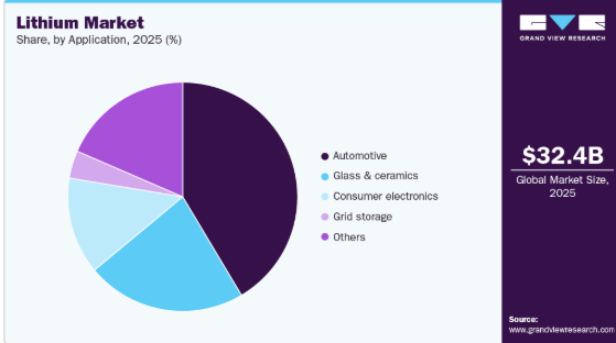 酸化リチウムはガラス・セラミックス産業で溶剤として機能する。さらにリチウムは潤滑油の製造にも利用され、ステアリン酸リチウムは増粘剤として性能と耐久性を向上させる。クリーンエネルギーへの世界的注目が高まる中、太陽光や風力エネルギー向けなどエネルギー貯蔵システムにおけるリチウムの重要な役割は、その重要性をさらに強調している。