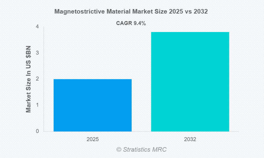 Stratistics MRCの調査によると、世界の磁歪材料市場は2025年に20億ドル規模となり、2032年までに38億ドルに達すると予測されています。予測期間中の年平均成長率(CAGR)は9.4%と見込まれています。