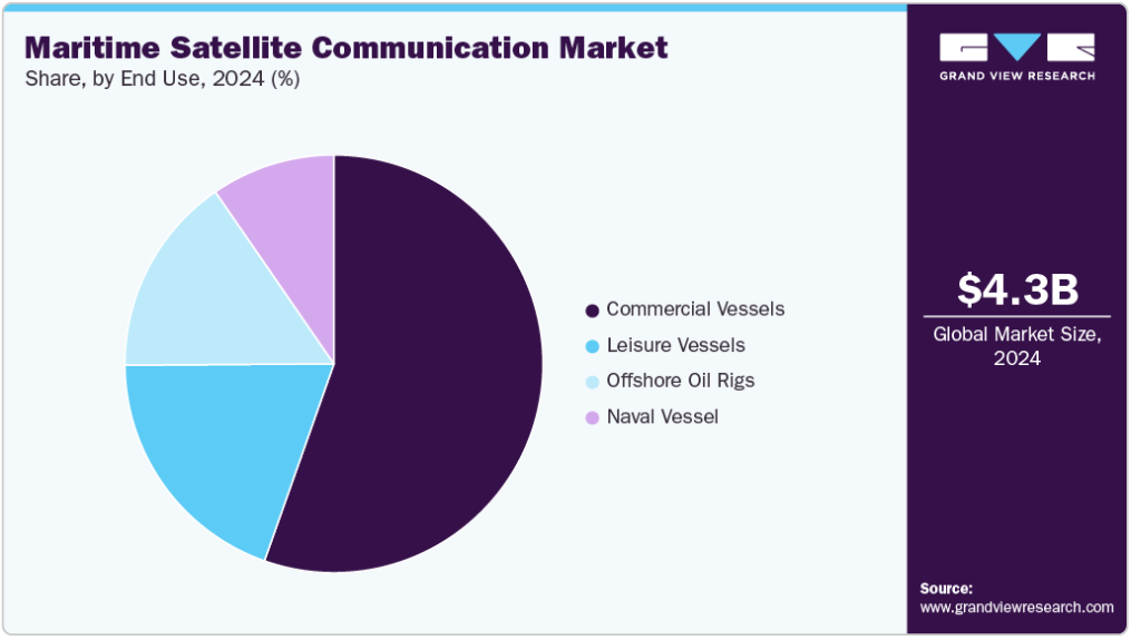 超小型衛星通信端末(VSAT)セグメントは、2024年に65.9%という最大のシェアを占めました。この成長は、遅延時間の短縮、グローバルなカバレッジなど、モバイル衛星サービス(MSS)に対するVSATの優位性に起因しています。ブロードバンドVSATネットワークは、船隊をカバーし船舶と陸上を結ぶ船内VPNネットワークの構築に利用される。この接続性は重要な業務アプリケーションをサポートし、VoIPトラフィックを伝送し、船舶の情報アクセスを向上させる。VSATは電子メール、ファイル共有、インスタントメッセージングなどへの定期的なインターネットアクセスを提供する。