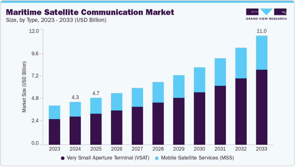 【英語タイトル】Maritime Satellite Communication Market (2025 - 2033)Size, Share & Trends Analysis Report By Type (Very Small Aperture Terminal (VSAT), Mobile Satellite Services (MSS)), By Revenue Source (Hardware, Software, Services), By End Use, By Region, And Segment Forecasts