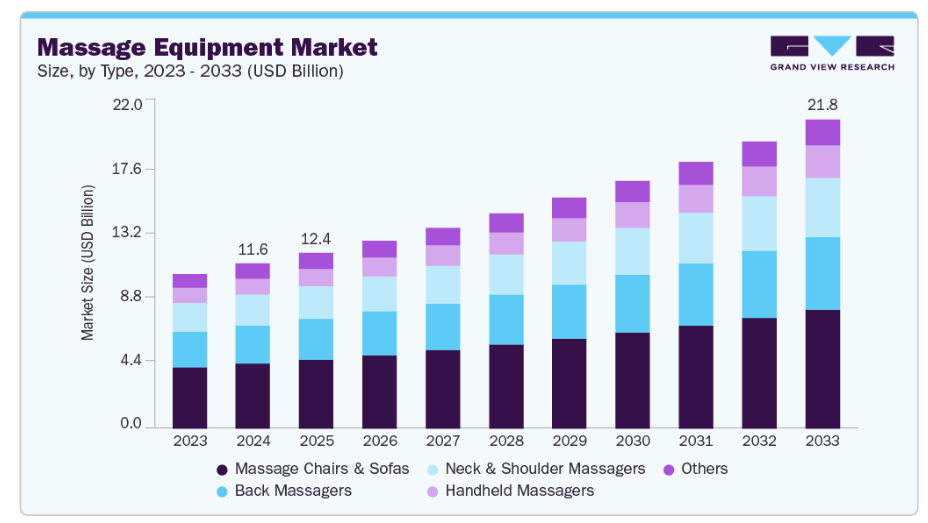 市場成長の背景には、ストレスレベルの上昇と座りがちな生活様式の増加があり、これらがリラクゼーションや痛み緩和ソリューションへの需要を促進しております。