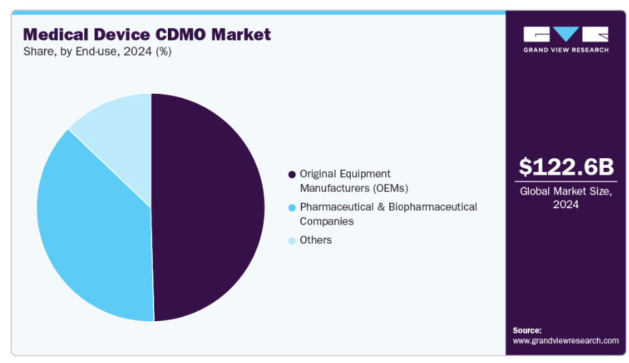 最終用途別では、予測期間中の2024年にオリジナル機器メーカー(OEM)セグメントが最大のシェアを占めました。OEMは製品開発と製造を強化するため、医療機器CDMOとの提携を拡大しています。これらのCDMOは、設計最適化、部品調達、規制順守、大規模生産などのサービスを提供し、医療機器生産の効率化を図ります。さらに、こうした連携によりOEMはコスト削減、スケジュール短縮、イノベーションと商業化への集中が可能となります。先進的な製造技術とグローバルなサプライチェーン管理の専門知識を有するCDMOは、高品質な生産と国際基準への準拠を確保し、市場の成長にさらに貢献します。加えて、CDMOはOEMが製品ポートフォリオの拡大、新規市場への進出、進化する医療機器環境における競争力の維持を可能にします。こうした要因が予測期間中の市場を牽引すると見込まれます。