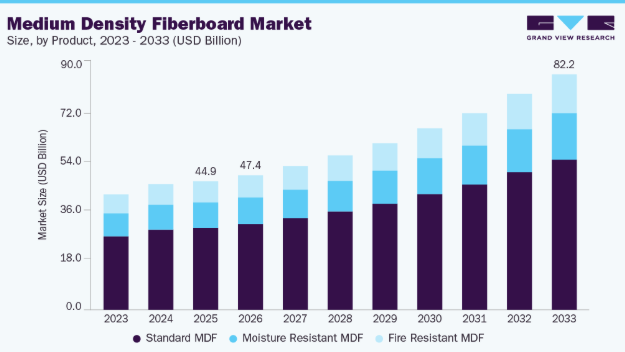 - 製品別では、標準中密度繊維板(MDF)セグメントが市場をリードし、2025年に66.0%という最大の収益シェアを占めた。