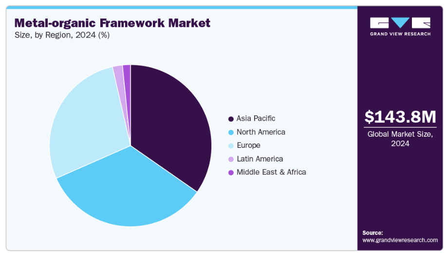 アジア太平洋地域は、化学・石油化学およびエネルギー集約型産業の急速な成長を背景に、2024年に金属有機構造体市場の収益シェア34.7%を占め、主導的な地位を維持しました。中国、インド、日本などの国々は、エネルギー転換イニシアチブと産業効率化を支援するため、MOFベースの水素貯蔵システム、CO₂分離装置、触媒プロセスに多額の投資を行っています。