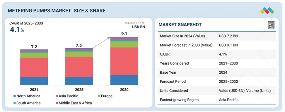計量ポンプ市場の規模は、2025年に75億米ドルと推定され、2030年までに年平均成長率(CAGR)4.1%で91億米ドルに達すると予測されています。