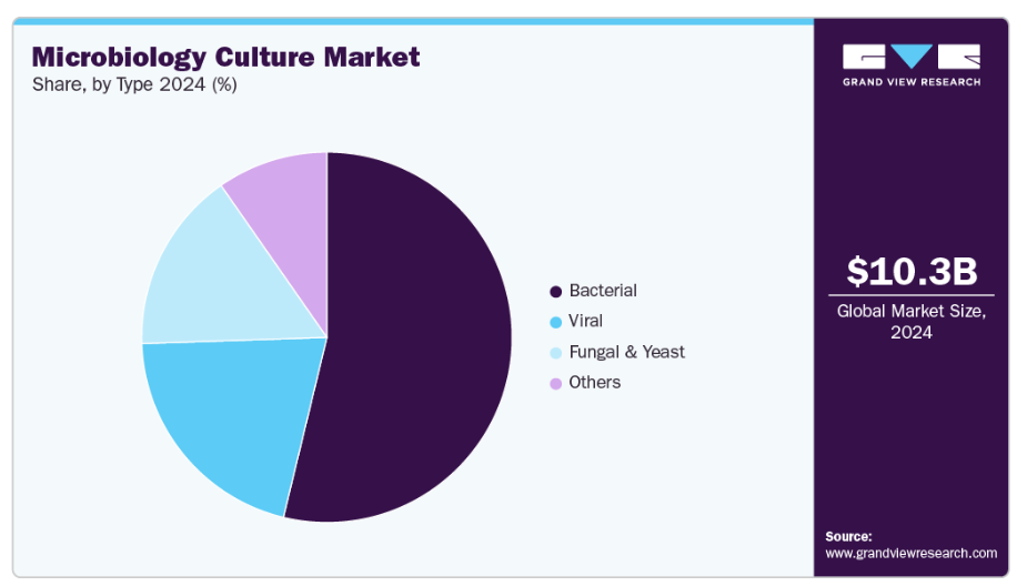 細菌セグメントは2024年に53.78%の市場シェアを占めました。このセグメントの成長は、抗菌薬耐性(AMR)検出への注目の高まり、特定の細菌株向けの選択的・鑑別培地の開発、世界的な検査室インフラへの投資増加によって支えられています。これらの要因が相まって、細菌セグメントの優位性と微生物培養産業における継続的な重要性を強化しています。